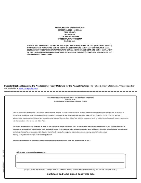 You are cordially invited to attend the Annual Meeting of Stockholders of CopyTele, Inc., a Delaware corporation, to be held at the Fox Hollow, Woodbury, New York, on Wednesday, October 31, 2012, at 10:30 a.m., local time, for the following purposes: