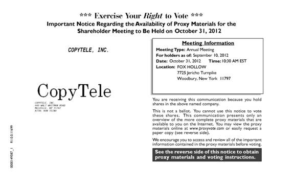 The Board of Directors of CopyTele, Inc. (“CopyTele”, “we”, “us” or the “Company”) is furnishing you this Proxy Statement to solicit proxies on its behalf to be voted at our Annual Meeting of Stockholders to be held on Wednesday, October 31, 2012, at 10:30 a.m., local time, and at any adjournments or postponements thereof. On or about September 21, 2012, we mailed to our stockholders of record as of the close of business on September 10, 2012 a notice containing instructions on how to access our proxy materials over the internet and vote. On or about September 21, 2012, we also began mailing printed copies of the Proxy Statement and the accompanying form of proxy to stockholders who had previously requested paper copies of our proxy materials.