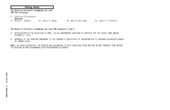 Common Stock represented by properly executed proxies received by us and not revoked will be voted at the Annual Meeting in accordance with the instructions contained therein. If instructions are not given, executed proxies will be voted FOR the election of each nominee for election as a director named herein, FOR the ratification of the appointment of KPMG LLP as CopyTele’s independent auditors for fiscal year 2012 and FOR the approval of the proposed amendment to the Company’s Certificate of Incorporation. The Board of Directors has not received timely notice (and does not know) of any matters that are to be brought before the Annual Meeting other than as set forth in the Notice of Annual Meeting. If any other matters properly come before the Annual Meeting, the persons named in the proxy or their substitutes will vote in accordance with their best judgment on such matters.