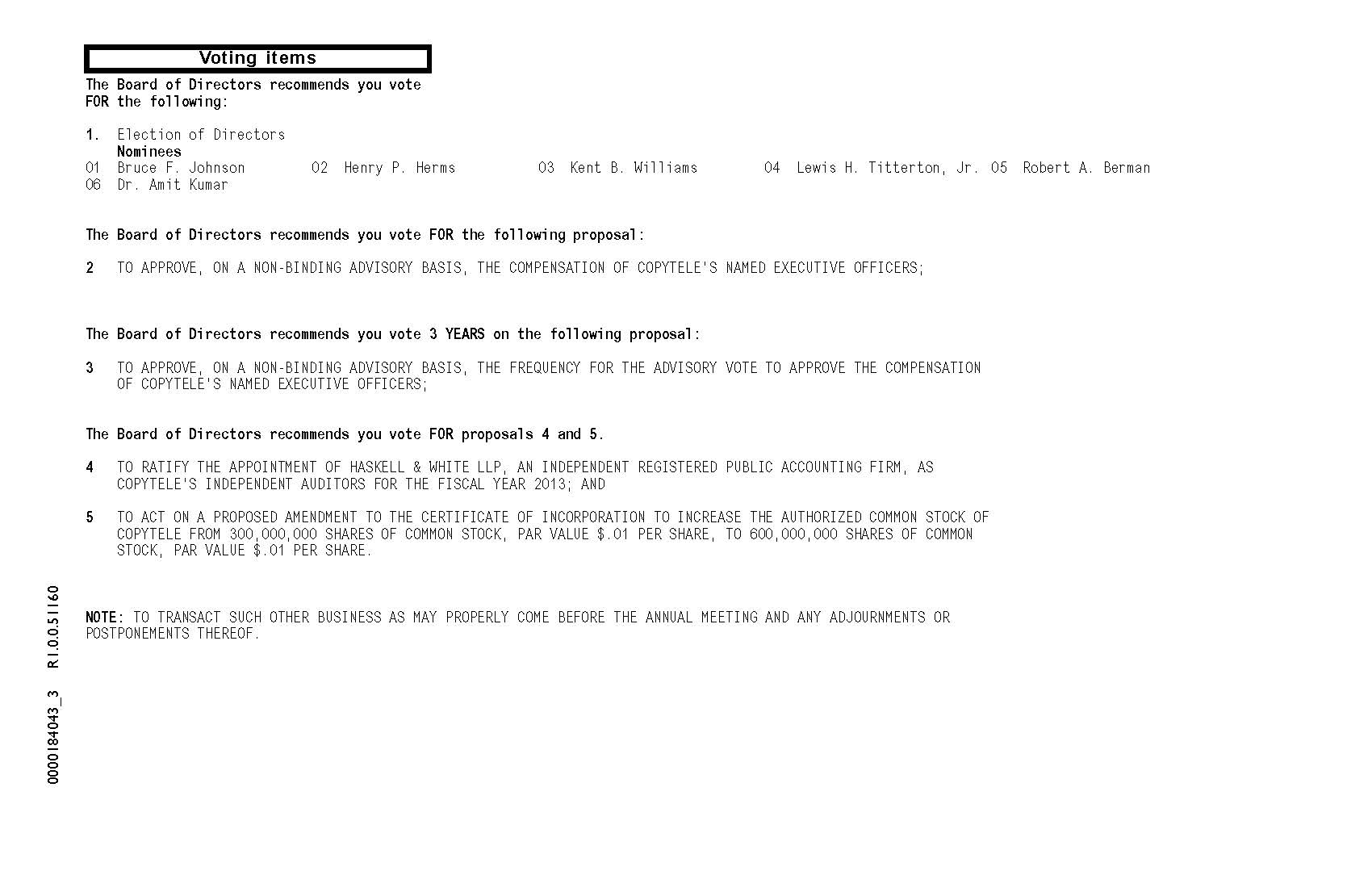 In addition, in accordance with Article I, Section 10 of our Amended and Restated By-laws, in order to be properly brought before the next annual meeting, a matter must have been: (i) specified in a written notice of such meeting (or any supplement thereto) given to stockholders of record by or at the direction of the Board of Directors (which would be accomplished if a stockholder proposal were received by the Secretary of the CopyTele as set forth in the preceding paragraph); (ii) brought before such meeting at the direction of the Board of Directors or the Chairman of the meeting; or (iii) specified in a written notice given by or on behalf of a stockholder of record on the record date for such meeting, or a duly authorized proxy for such stockholder, which conforms to the requirements of Article I, Section 10 of our Amended and Restated By-laws and is delivered personally to, or mailed to and received by, the Secretary of CopyTele at the address set forth in the preceding paragraph not less than 45 days prior to the first anniversary of the date of the notice accompanying this Proxy Statement; provided however, that such notice need not be given more than 75 days prior to the next annual meeting. For purposes of our next annual meeting, any stockholder who wishes to bring business before the meeting must submit the required notice to the Secretary of CopyTele not later than the close of business on July 13, 2014.