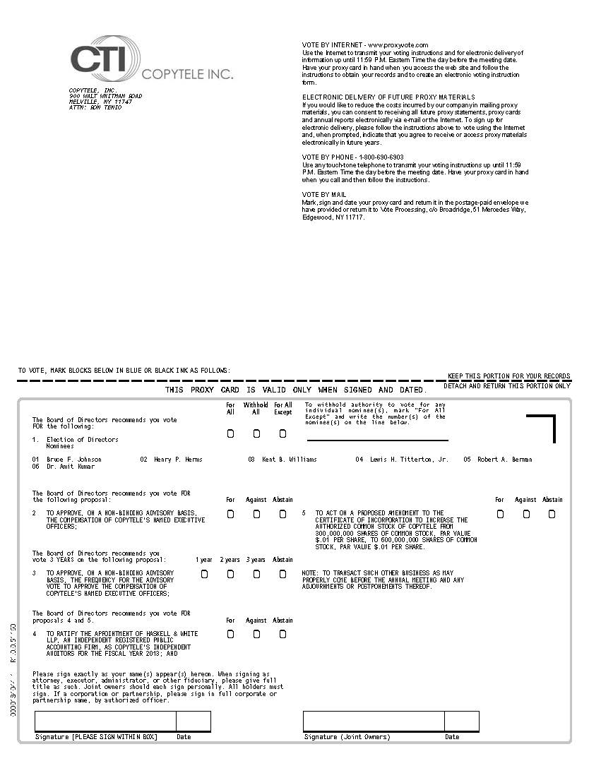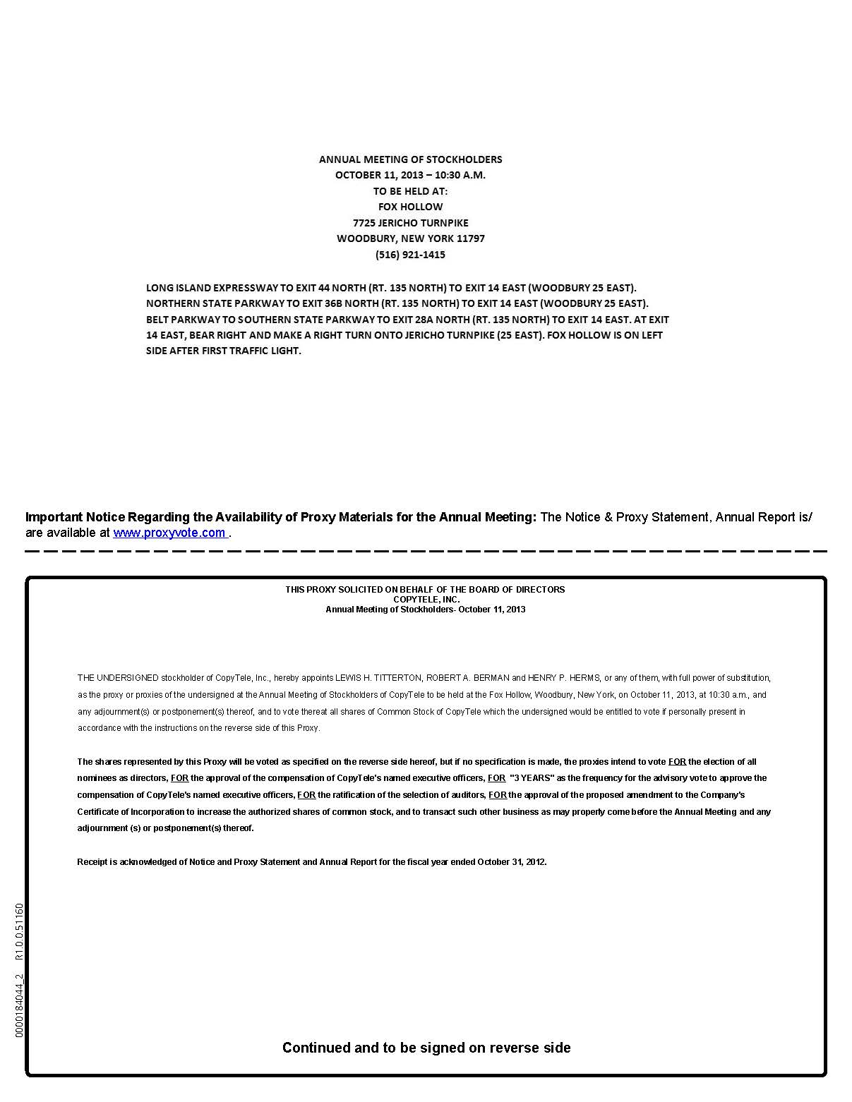 You are cordially invited to attend the Annual Meeting of Stockholders of CopyTele, Inc., a Delaware corporation, to be held at the Fox Hollow, Woodbury, New York, on Friday, October 11, 2013, at 10:30 a.m., local time, for the following purposes: