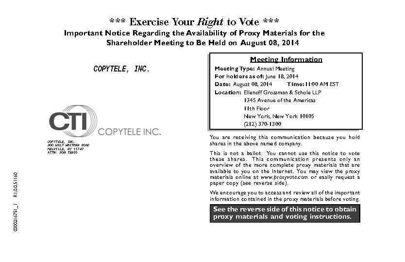 This proxy statement is furnished in connection with the solicitation of proxies by the Board of Directors (the Board) of CopyTele, Inc. (the Company) for use at the 2014 Annual Meeting of Stockholders of the Company and at all adjournments and postponements thereof (the Meeting). The Meeting will be held at 11:00a.m. on Friday, August 8, 2014, at the law offices of Ellenoff Grossman & Schole LLP, 1345 Avenue of the Americas, 11th Floor, New York, New York 10105, for the following purposes:
